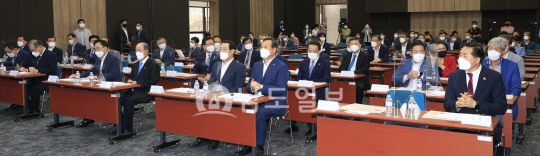 6일 오후 광주상공회의소에서 헤럴드경제·코리아헤럴드 호남취재본부 개소식 열렸다. 이날 중흥그룹 정창선 회장과 정원주 부회장, 이용섭 광주시장, 김용집 시의회 의장, 윤병태 전남도 정무부지사, 전창협 헤럴드 대표, 최진영 코리아헤럴드 대표, 남도일보 전병호 부회장·김성의 남도일보 사장, 지역 국회의원 등이 기념촬영을 하고 있다. /임문철 기자 35mm@namdonews.com