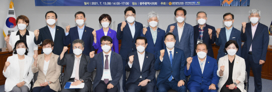 광주광역시의회 개원 30주년 기념 정책토론회가 13일 시의회에서 열린 가운데 이용섭 광주시장과 김용집 시의회 의장, 장휘국 시교육감, 시·구의원들이 기념촬영을 하고 있다. /광주시의회 제공