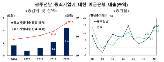 금융기관대출 중 지난해 광주·전남지역 예금은행의 중소기업대출 증가액은 4조4천억원으로 관련 통계가 작성된 2008년 이래 최대규모를 기록했다. 이 시기 대출증가율(13.4%)도 가파르게 상승하며 전국 평균(12.1%)을 상회했다.