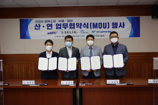 한국광기술원은 27일 ㈜셀릭, ㈜그린광학, 영우DSP 등 자외선 광학소재와 렌즈, 검사장비 전문기업과 함께 광학산업 글로벌 경쟁력 확보와 미래시장 선점을 위한 기술개발 및 기업지원 업무협약을 맺었다.