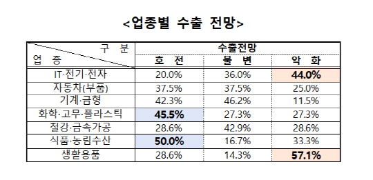 업종별로는 화학·고무·플라스틱과 식품·농림수산은 하반기 수출여건이 ‘호전’될 것으로 내다봤다. 반면 IT·전자와 생활용품 업종은 ‘악화’될 것으로 응답했다. 자동차(부품), 기계·금형, 철강·금속가공은 전년 동기와 비슷할 것으로 전망했다.