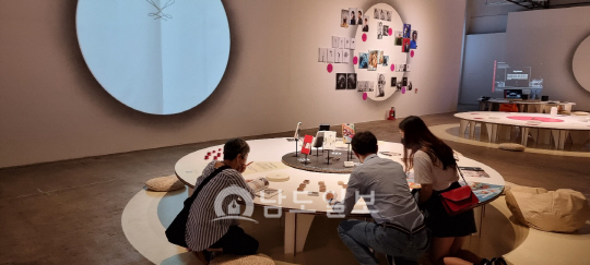 관람객들은 테이블에 앉아 스펨프를 찍어보기도 하고, 또다른 관람객은 뮤지컬 꽃병을 두드리며 자신만의 소리를 만들어 본다.