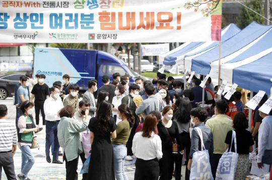 13일 오후 2시께 광주광역시 북구청사 앞 광장에서 진행된 ‘북구 상생장터’ 참여 상인 A(54·여)씨는 환한 미소를 보이며 이같이 말했다. A씨가 장터에서 판매한 품목은 혼합견과로 상생장터가 개시된 지 10분이 채 지나지 않았지만, A씨가 준비한 물품은 어느새 바닥을 보이고 있었다.