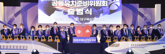 지난 11월 15일 오후 대구육상진흥센터에서 열린 ‘2038년 하계 아시안게임 광주·대구 공동유치 준비위원회 출범식’에서 이용섭 광주시장과 권영진 대구시장 등이 아시안게임 유치 성공 기원 퍼포먼스를 하고 있다. /광주시 제공