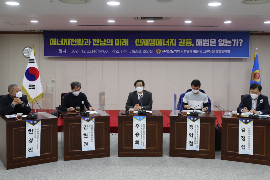 23일 전남도의회 기후위기 대응 및 그린뉴딜 특별위원회는 전날 도의회 초의실에서 ‘에너지전환과 전남의 미래, 신재생에너지 토론회’를 열었다.