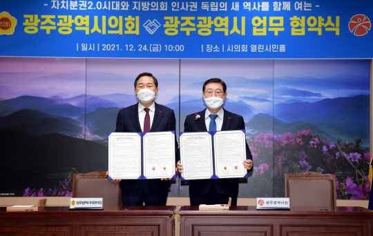 광주광역시와 광주광역시의회는 24일 시의회 열린시민홀에서 지방의회 인사권 독립에 따른 인사운영 등 업무 전 분야에 대한 업무협약을 체결했다.