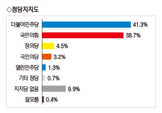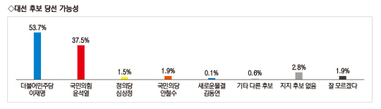 성별로는 남성과 여성 모두 이 후보가 높았다. 이 후보는 남녀 각각 45.9%·42.2%를 기록했다. 윤 후보는 남 34.7%·여 36.5%였다. 민주당 지지자의 89.7%는 이 후보를, 국민의힘 지지자의 79.3%는 윤 후보를 지지해 정당별 지지 성향은 비슷했다.