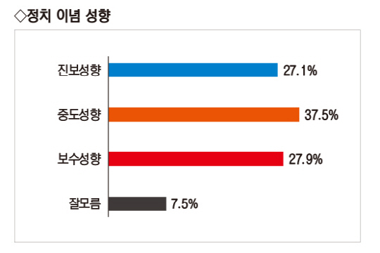 ◆중도층 37.5%…최대 ‘승부처’=이념성향에서는 자신의 성향을 ‘중도’라고 응답한 층이 37.5%로 가장 높았고 보수(27.9%), 진보(27.1%), 잘모르겠다 (7.5%) 순으로 뒤를 이었다. ‘중도’와 ‘잘모르겠다’가 45%에 달하면서 오는 3월 대선은 지난 대선·총선 등과 달리 중도 우위 지형으로 치러질 가능성이 높아 중도층 표심 공략이 차기 대선의 최대 승부처가 될 것으로 보인다.
