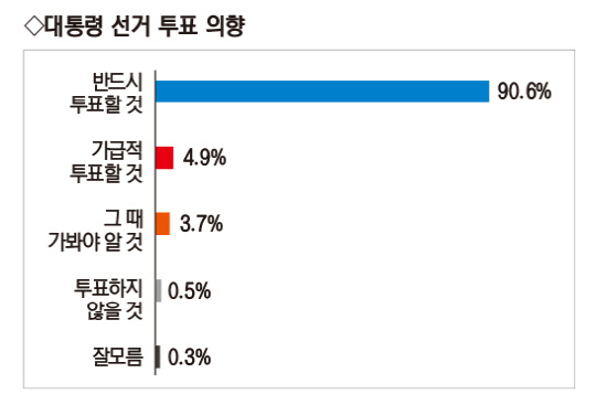 ◆10명 중 9명 “반드시 투표”=이번 조사에서 3월 대통령 선거에서 투표할 생각인지 물은 결과 ‘반드시 투표할 것이다’가 90.6%, ‘가급적 투표할 것이다’ 4.9%로 투표 의향층이 95.5%에 달했다. ‘그때 가 봐야 알겠다’는 응답은 3.7%, ‘투표하지 않겠다’ 0.5%, ‘모르겠다’ 0.3% 응답에 그쳤다.