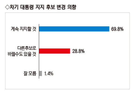 국민의당 안철수 7.7%, 정의당 심상정 3.8%, 새로운물결 김동연 0.5% 순으로 나타났다. 지지 후보 없음은 5.4%, 잘 모르겠다 1.6%, 기타 1.3% 였다.