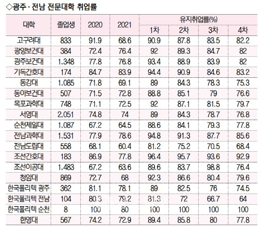 2021학년도 졸업생 취업자 중 유지취업률은 4차례 진행된 유지취업률 조사에서 조선간호대학이 92.9%로 가장높았다. 이어 전남과학대학(85.6%), 기독간호대학(83.2%), 고구려대학(82.2%), 광양보건대·광주보건대(82%)가 뒤를 이었다.