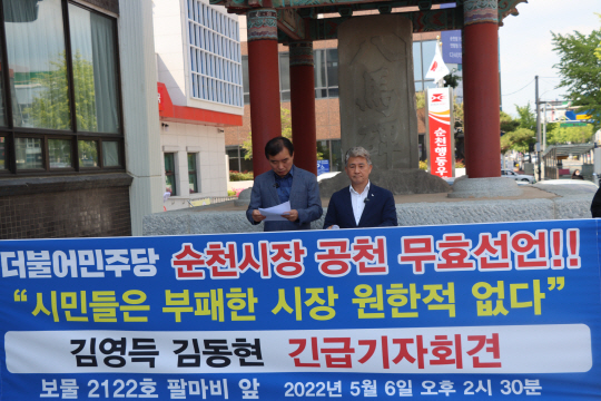 앞서 지난 6일에는 공관위 심사에서 컷오프된 김동현, 김영득 전 예비후보는 순천 팔마비 앞에서 공동기자회견을 열고 ”차기 순천시장은 반드시 청렴하고 강직한 사람이 선출돼야 한다“고 주장했다.