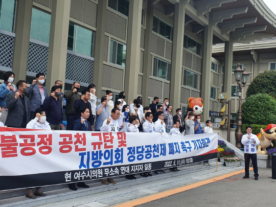 무소속연대 소속 여수시의원 7명은 지난 11일 오전 10시 여수시청 본관 입구에서 지지자들과 함께 기자회견을 열고 잘못된 지방의원 정당공천제 문제점을 제기했다.