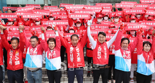 제8회 전국동시지방선거 공식 선거운동 첫날인 19일 광주광역시 북구 광주역 앞 광장에서 국민의힘 주기환 광주시장 후보와 광주지역 출마 후보자들이 출정식을 갖고 지지를 호소하고 있다. /임문철 기자 35mm@namdonews.com