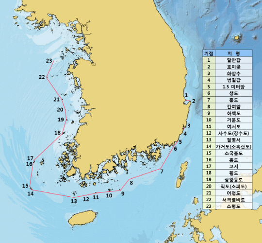 우리나라의 영해를 결정짓는 두 가지 방법은 직선기선과 통상기선으로 나뉜다. 물이 가장 많이 빠지는 선을 저조선으로 하고, 이 선을 기준으로 영해의 기준선이 된다. 우리나라는 울릉도, 독도, 제주도와 같이 해안이 비교적 단순한 지역은 통산기선으로 적용되지만, 우리나라 대부분의 해안은 특히, 서해와 남해의 경우 섬이 많고 해안선이 복잡해서 가장 외곽에 있는 섬들을 연결해서 영해선을 만드는 직선기선을 이용하고 있다. 이 직선기선에 전체 23개 기점들이 지정되어 있다(그림 2 참조).