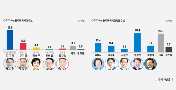 광주시교육감 후보 지지도 조사에서는 이정선 후보가 28.4%로 13.4%를 얻은 박혜자 후보를 15%p격차로 따돌렸다. 이정재 후보와 정성홍 후보는 각각 9.4%를 획득해 동률을 기록했고 강동완 후보는 4.5%를 얻었다. 기타 27.3%, 잘 모름 7.7%로 조사돼 부동층은 전체 응답자의 35%를 차지했다.