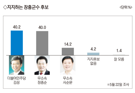 현직 무소속 군수 후보와 더불어민주당 후보의 대결로 관심을 모은 전남 장흥군수 선거는 민주당 김성 후보가 지지후보 여론조사에서 무소속 정종순 후보와 불과 0.2%p 차이로 초접전 양상을 보이고 있다.