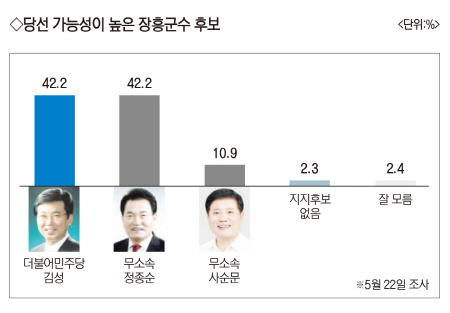 ‘당선가능성이 높은 장흥군수’ 질문엔 김 후보와 정 후보 모두 42.2%로 비등했다.