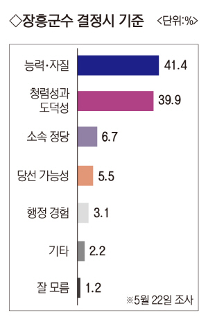 ‘장흥군수 결정시 가장 중요한 기준’으로 41.4%가 후보자 능력과 자질을 꼽았다. 후보 청렴성과 도덕성 39.9%·소속정당 6.7%·당선가능성 5.5%·행정경험 3.1%·기타 2.2% 순이다.