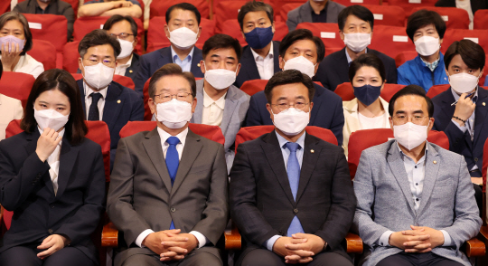 더불어민주당 이재명 총괄선대위원장과 윤호중 공동상임선대위원장 등 지도부가 1일 국회에 마련된 종합상황실에서 출구조사 방송을 지켜보고 있다. 왼쪽부터 박지현 공동상임선대위원장, 이재명 총괄선대위원장, 윤호중 공동상임선대위원장, 박홍근 원내대표. /연합뉴스