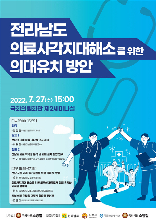 더불어민주당 소병철 의원(전남 순천·광양·곡성·구례갑)은 전남도, 순천시, 순천대학교와 함께 오는 27일 오후 3시 국회의원회관 제2세미나실에서 ‘전남도 의료사각지대 해소를 위한 의대유치 방안 포럼’을 개최한다고 25일 밝혔다.