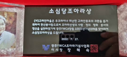 또한 국내 입국 후 광주 정착을 희망할 경우 임대료와 월세, 생활비 등을 지원하며 우크라 탈출 고려인동포들의 안정된 조기정착을 지원했다. 이런 헌신적인 노력을 인식한 광주YWCA가 창립 100주년을 맞아 고려인마을에 ‘소심당조아라상’ 을 수여한 후 그동안의 노고에 고마움을 전했다.