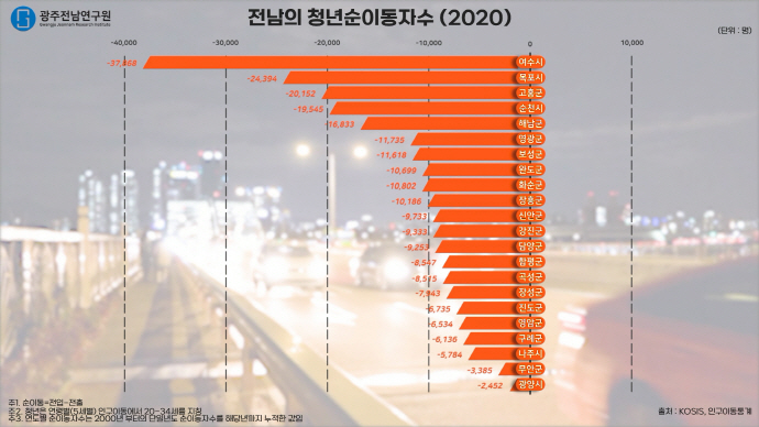 광주전남연구원(원장 박재영)은 16일 ‘한눈에 보는 광주전남’ 이슈&통계를 발간해, 전국에서 가장 많은 인구감소위기지역(16개군)이 포함된 전남의 청년인구 순이동자 수 통계(2000~2020년)를 정리, 발표했다.