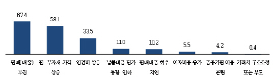 자금사정 곤란원인으로 ▲판매·매출부진(67.4%·복수응답) ▲원·부자재 가격 상승(58.1%) ▲인건비 상승(33.5%) ▲납품대금 단가 동결·인하(11.0%) 순으로 꼽았다.