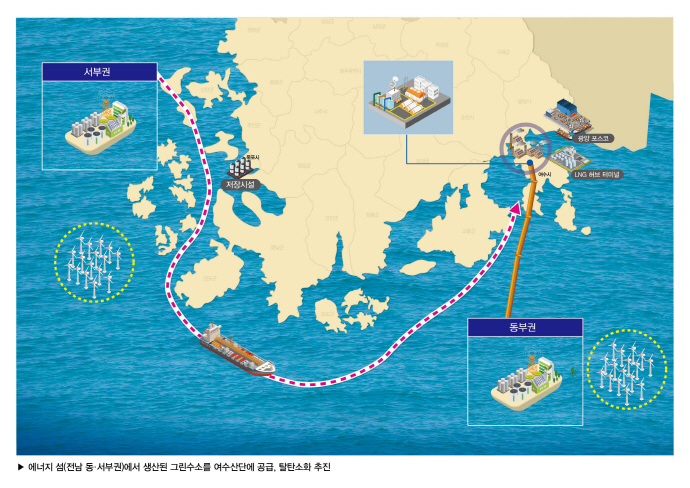 그린수소 에너지섬 조성사업은 8.2GW 대규모 해상풍력 발전을 활용한 잉여 전력, 전남의 비교우위 자원인 섬에 수전해 설비를 구축해 생산한 그린수소가 큰 틀이다. 생산한 그린수소는 상대적으로 탄소 배출량이 많은 철강·석유화학 단지 등에 공급해 에너지전환을 통한 탄소중립을 실현한다는 방침이다.‘광양만권 수소산업 융복합 플랫폼 구축’사업은 광양만권의 우수한 철강·석유화학 산업환경 기반을 수소산업 전주기 생태계 조성을 위한 것이다.