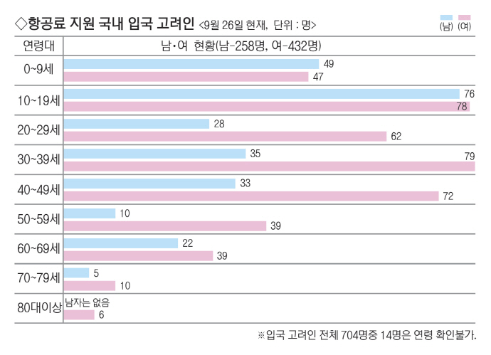 연령대별로는 ▲0~9세 96명(남 49·여 47) ▲11~19세 청소년이 154명(남 76·여 78)으로 19세 이하가 전체 36.2%로 가장 많은 비율을 차지했다. 여성의 경우 30대 79명(11.4%), 40대 72명(10.4%)으로 10대와 함께 높은 분포를 보였다. 30대 남성은 35명(5.0%), 40대 33명(4.7%)으로 같은 연령대 여성의 절반도 안됐다. 이는 영유아 및 10대 청소년을 자녀로 둔 여성들이 가족단위로 국내 입국하고 있음을 엿볼 수 있다.