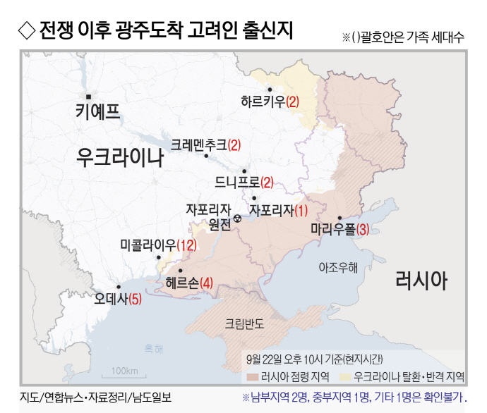 광주에 온 고려인은 우크라이나 남부를 비롯 러시아와 직접 교전하는 지역 출신이 많았다. 미콜라이우 12명, 오데사 5명, 헤르손 4명, 마리우폴 3명, 하루키우 2명, 드니프로 2명, 크레멘추크 2명, 자포리자 1명 등이었다. 러시아와 국경을 접하고 있거나 군사적 요충지로 러시아의 공세가 심한 지역들이다. 현재도 상당지역이 러시아 점령지로 돼 있다. 이 밖에 ‘남부지역’ 2명, ‘중부지역’ 1명, 기타 1명으로 나타났다.