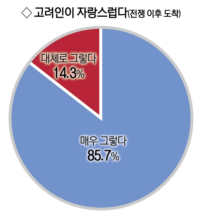 그럼에도 고려인 정체성 의지는 강하게 나타났다. ‘나는 고려인이라는 것이 자랑스럽다’는 질문에 30명이 ‘매우 그렇다’고 밝혔다. ‘대체로 그렇다’는 5명이었다. ‘고려인 문화보존 계승’과 관련해선 28명이 ‘매우 그렇다’고 응답했다. ‘대체로 그렇다’는 7명으로 조사됐다.