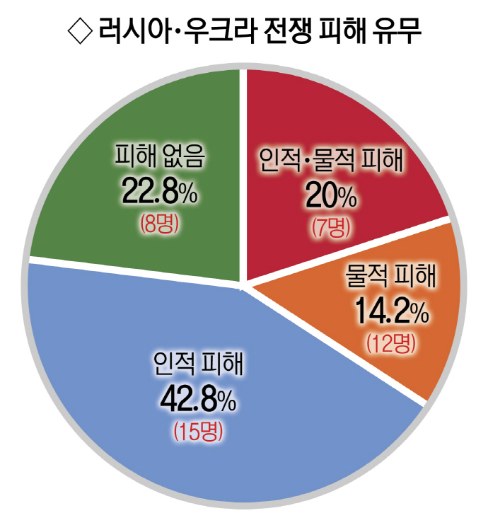 설문에 응한 고려인 대부분은 직접적인 전쟁 피해를 입은 것으로 나타났다. ‘전쟁으로 가족이 사망하거나 부상당했다’고 응답한 사람은 15명(42.8%)이었다. 집 파손 등 물적 피해를 입었다는 응답은 5명(14.2%)이었다. 인적 피해와 물적 피해를 같이 당했다는 사람은 7명(20%)으로 파악됐다. 8명(22.8%)은 피해 유무를 밝히지 않았다.