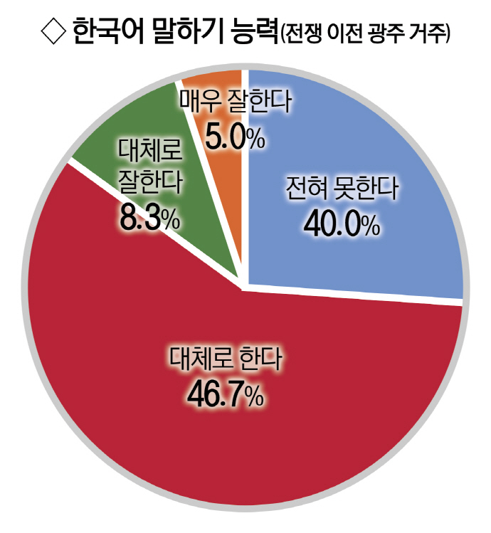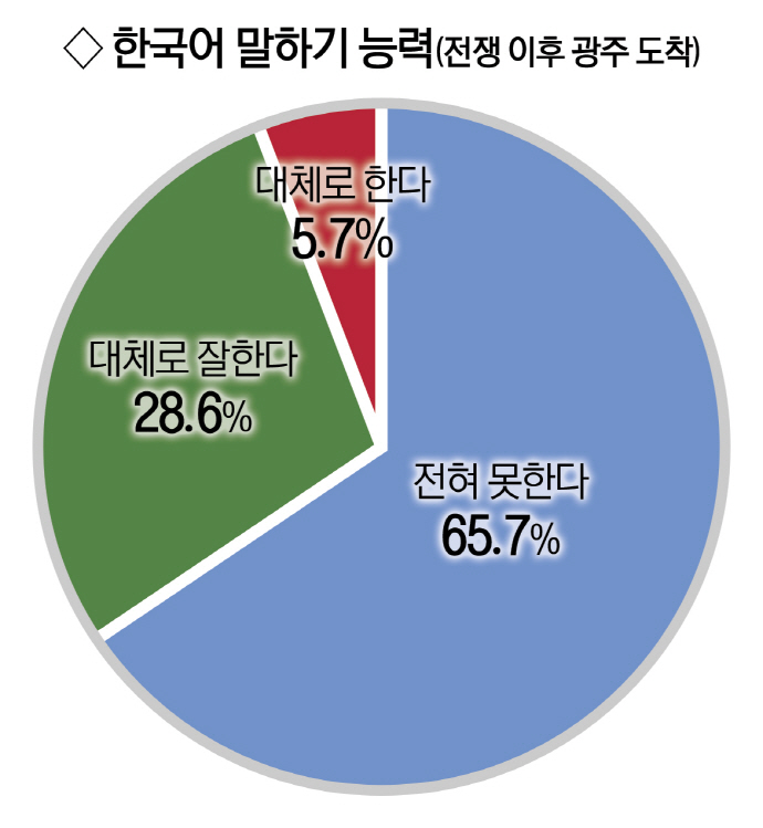 한국어 구사 능력은 떨어졌다. 23명(65.7%)이 ‘한국말을 전혀 하지 못한다’고 응답했다. ‘조금한다’가 10명(28.5%), ‘보통 수준’ 2명(5.7%)이었다.