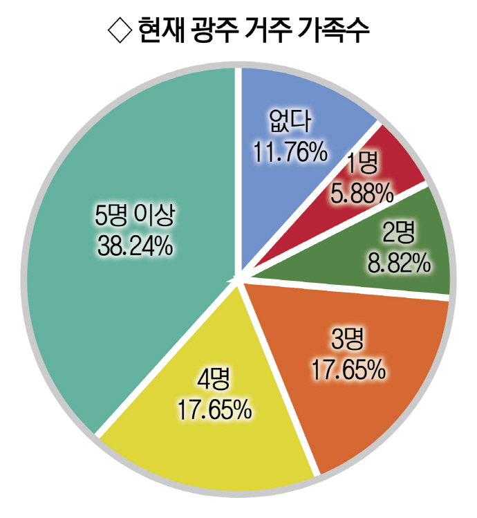 전쟁 이후 광주에 도착한 고려인들은 한 사람당 평균 5.2명의 가족 및 친인척과 살고 있는 것으로 조사됐다. ‘현재 광주에서 함께 사는 가족과 친인척은 모두 몇 명입니까’라는 물음에 가족대표 35명 중 34명이 ‘1명 이상’을 응답했다. 34명의 가족 및 친인척을 합한 숫자는 183명이었다. 가장 많은 가족은 13명이었다.