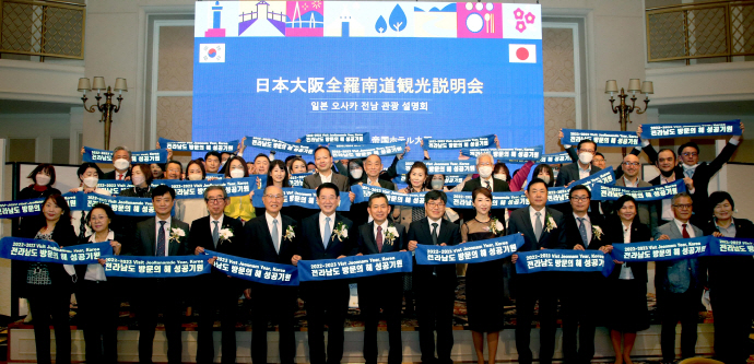 이날 전남도와 전남관광재단 주최로 일본 오사카 국제호텔서 2022~2023 전남 방문의 홍보활동을 벌인 김 지사는 “천하의 부엌, 미식 관광의 중심지인 오사카에서 전남 방문의 해 관광설명회를 개최해 뜻깊다. 세계적 관광자원을 보유한 남해안을 글로벌 해양 관광벨트로 만들기 위해 제주도를 포함한 4개 시·도가 공동으로 세계적 관광지로 개발해 케이(K)-관광을 선도하겠다”고 말했다.