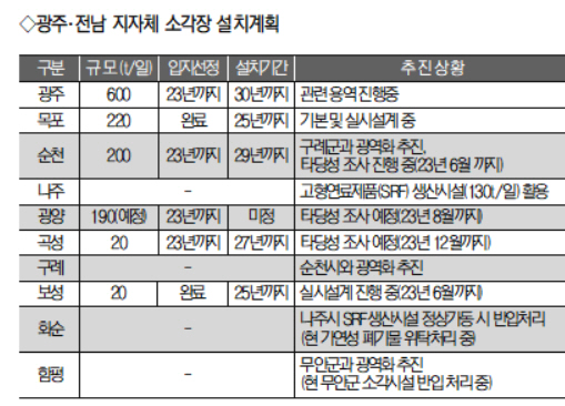 광양시는 하루 190t의 생활폐기물을 처리하기 위해 소각장 건립을 추진 중이다. 올해 안으로 타당성 조사를 마치고 입지 선정 절차에 들어갈 전망이다. 보성군은 하루 20t의 쓰레기를 처리하는 소각장을 2025년 건립한다.