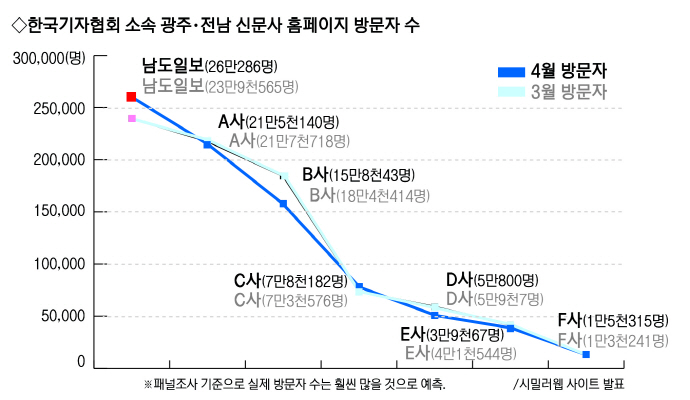 9일 시밀러웹 발표 결과에 따르면 지난 4월 한 달 간 남도일보 방문자 수는 26만286명으로 기자협회 소속 신문사 가운데 1위를 차지했다. 이어 A사 21만5천140명, B사 15만8천43명, C사 7만8천182명, D사 5만800명, E사 3만9천67명, F사 1만5천315명 순이었다.