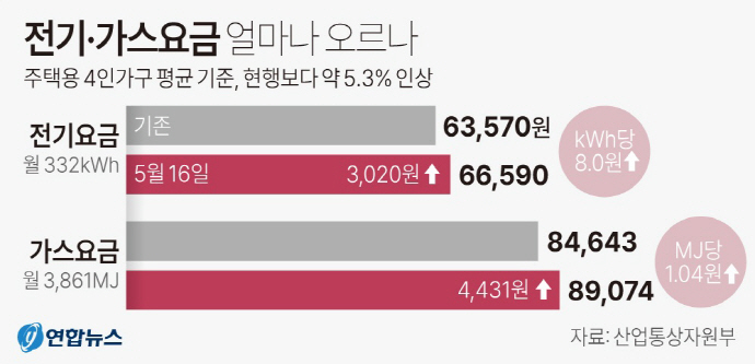 16일부터 전기요금이 ㎾h(킬로와트시)당 8원, 가스요금은 MJ(메가줄)당 1.04원이 오른다. 이에 따라 4인 가구의 월평균 전기·가스요금 부담은 총 7천400원 늘어날 것으로 보인다.
