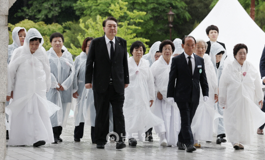 윤 대통령은 흰색 우비를 입은 참석자들 사이에 앉았다. 양옆에도 오월 어머니들이 자리했다. 어머니들은 기념식 중간중간 눈물을 훔쳤다.