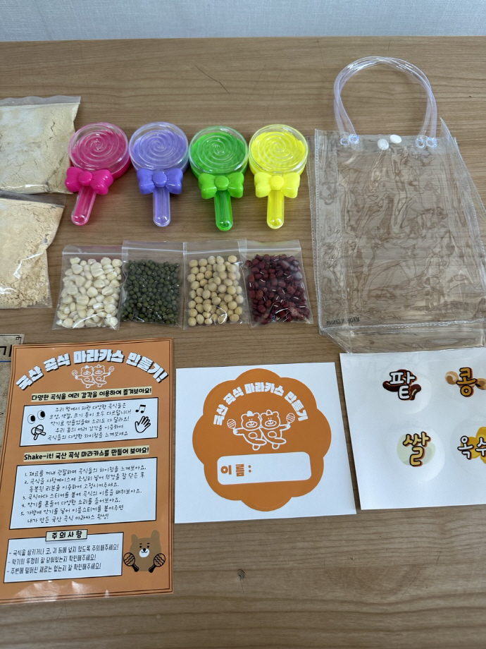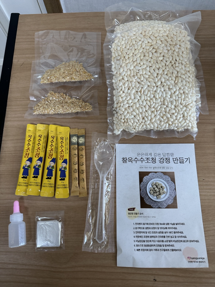 체험 키트는 총 4가지로 찰옥수수 조청 강정 만들기, 내 손으로 직접키워 먹는 NON-GMO 국산 콩나물, 옥수수전통과자 만들기, 국산 곡식 마라카스 만들기 등이다.