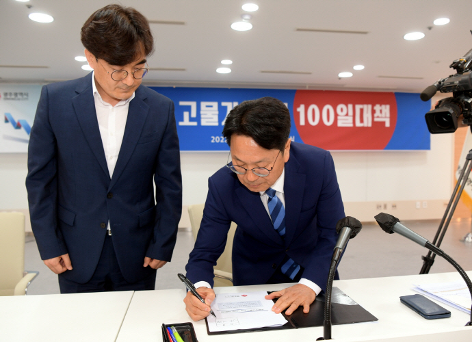 강기정 광주광역시장이 지난해 7월 1일 오후 시청 중회의실에서 열린 민생분야 현안토론에 앞서 취임 첫 결재로 ‘고유가·고물가 민생 100일 대책’ 추진안에 서명하고 있다./광주시 제공