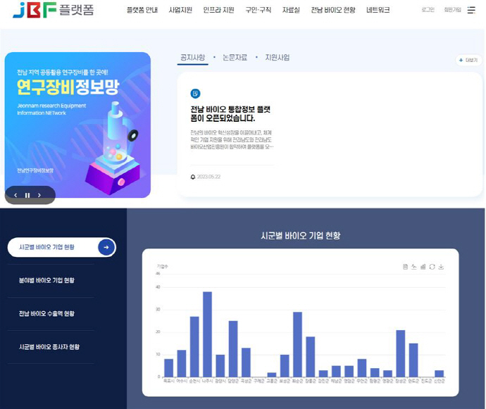 전남 바이오 원스톱 플랫폼은 전남 바이오산업 진흥과 기업 지원을 위한 것으로 입주 공간, 연구장비 활용, 투자 지원, 정부·지자체 지원사업, 구인·구직, 특허·인증 등 바이오 분야 유용한 정보를 제공한다.