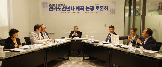 27일 오후 2시부터 남도일보 본사 회의실에서 진행된 긴급현안 ‘전라도천년사 왜곡논쟁’ 토론회에서는 편찬위원회를 대표한 3인과 시민단체 등을 대표하는 3인 등 총 6명이 패널로 나서 쟁점별 논쟁을 진행했다.