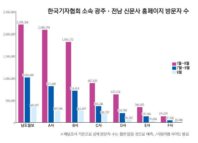 또 올해 1∼9월 아홉 달 동안 남도일보 방문자 수는 220만8천368명으로 역시 광주·전남기자협회 소속 신문사 가운데 1위를 차지했다. 이어 A사 208만8천394명, B사 181만6천132명, C시 88만7천829명, D사 63만3천114명, E사 34만6천3명, F사 13만9천39명 순이었다. 시밀러웹 데이터 통계는 패널 조사를 기반으로 분석한 것이어서 실제 홈페이지 방문자 수는 훨씬 많을 것으로 예측된다.