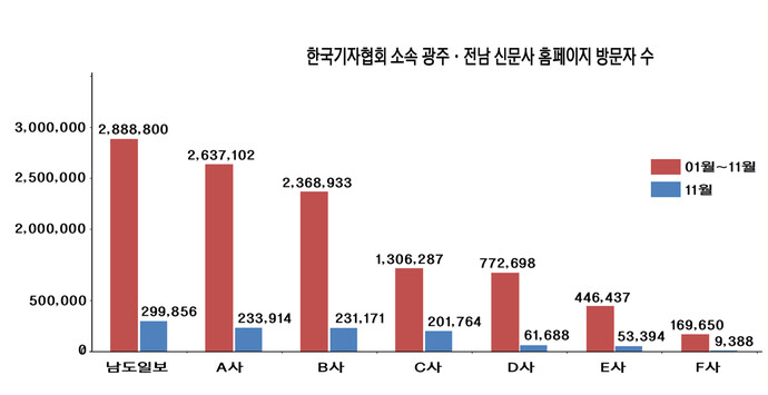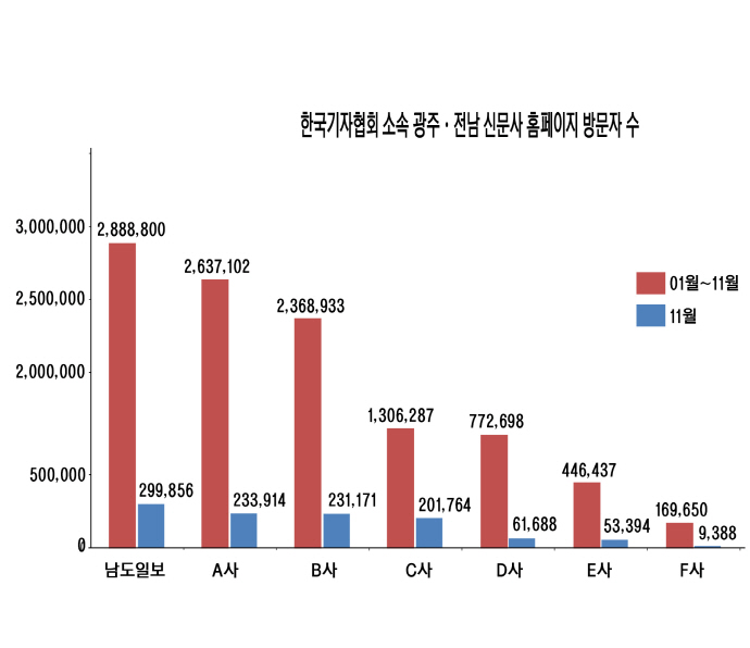 12일 시밀러웹 발표에 따르면 11월 남도일보 홈페이지 방문자 수는 29만9천856명으로 광주·전남기자협회 소속 7개 신문사 가운데 1위를 기록했다. 이로써 남도일보는 7월부터 5개월 연속 1위에 랭크되며 11개월 누적 288만8천800명으로 부동의 1위를 고수했다. 시밀러웹 데이터 통계는 패널 조사를 기반으로 분석한 것이어서 실제 홈페이지 방문자 수는 훨씬 많을 것으로 예측된다.