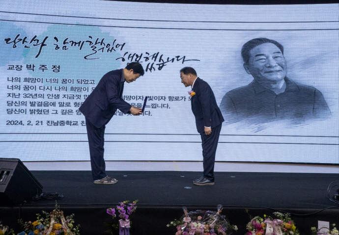 박 전 교장의 퇴임식은 지난 21일 오후 광주 남구 진남중 강당에서 이정선 광주시 교육감 등 각계각층의 인사 700여 명이 함께한 가운데 그동안 그의 공로를 치하하는 감사 인사 속에서 진행됐다.