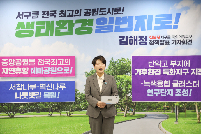 김해정 후보는 “서구를 전국 최고의 공원도시로, 생태환경 일번지로 만들겠다”면서 “중앙공원을 금당산, 영산강과 연결하는 문화·휴양·체험·예술공간으로 전국 최고의 도심 속 자연휴양 테마공원으로 조성하고, 영산강권인 서창나루에서 벽진나루까지 나룻뱃길을 복원하겠다”고 밝혔다.
