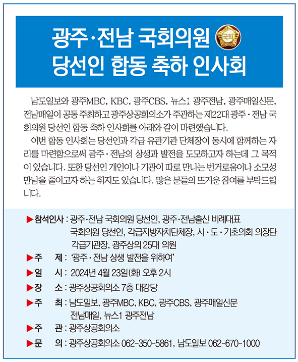 남도일보와 광주MBC, KBC, 광주CBS, 뉴스1 광주전남, 광주매일신문, 전남매일이 공동 주최하고 광주상공회의소가 주관하는 제22대 광주·전남 국회의원 당선인 합동 축하 인사회를 아래와 같이 마련했습니다.