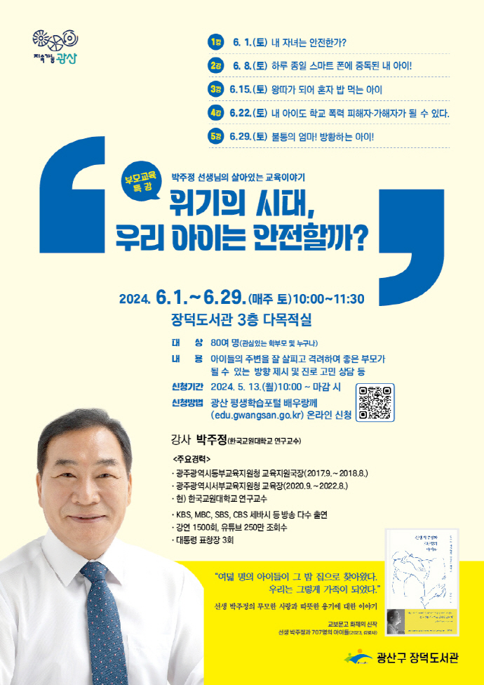 광주 광산구 장덕도서관이 한국교원대학교 연구교수인 박주정 씨(전 광주서부교육지원청 교육장)를 초청해 ‘위기의 시대, 우리 아이는 안전할까?’를 주제로 한 부모교육 특강을 운영한다.